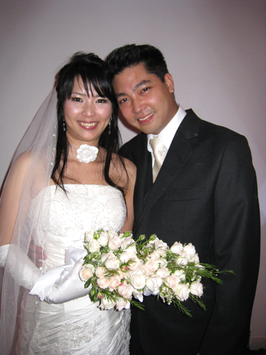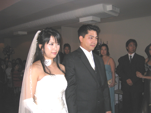 土曜日の夜6時30分、式場のレストランのホールで神父さんの前に立ち、型どおりの誓いの言葉を述べ、そのあと披露宴。