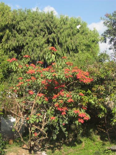 そしてクリスマスが近づくと、真っ赤な葉(正確には苞という部分)をつけた可憐なポインセチアの鉢植えが至る所でみられるかと思います。ネパールでもポインセチアはポピュラーな植木ですが、日本のものとは様子がかなり異なります。