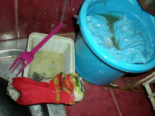 白いプラスチック容器に入れ水で溶き、靴下で食器を洗います。