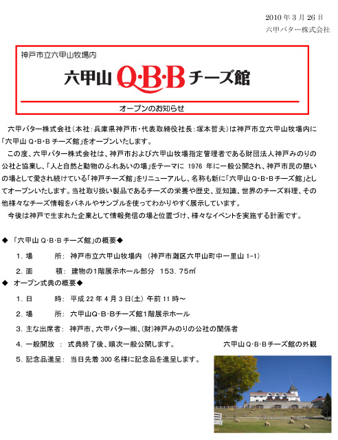 六甲バター株式会社が、神戸市および六甲山牧場指定管理者である財団法人神戸みのりの公社と協業し、「人と自然と動物のふれあいの場」をテーマに1976年に一般公開され、神戸市民の憩いの場として愛され続けている「神戸チーズ館」をリニューアルし、名称も新に「六甲山Q・B・Bチーズ館」としてオープンするとのこと。