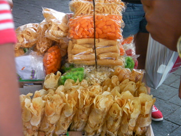 そのほかにも、揚げたスナックパフ(緑色やオレンジ色)、いろいろな形をしたスナックがカリカリと美味しく揚げられています。