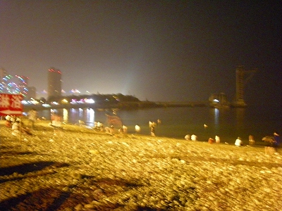 昼間は家族連れで賑わうビーチ。夜も明るくライトアップされているので、水際で楽しむ人々がたくさんいます。この写真は夜の10時近くですが、よく見ると泳いでいる人もいます。