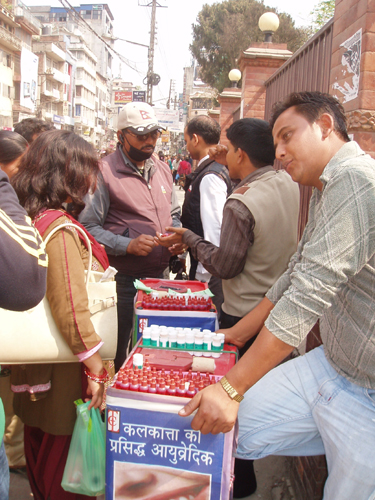 白い粉と液体を混ぜて、脱脂綿に含ませ歯を拭くと、きれいになる!ということです。セット販売で100ルピー。それが実際に次々と人が訪れ飛ぶように売れていました。