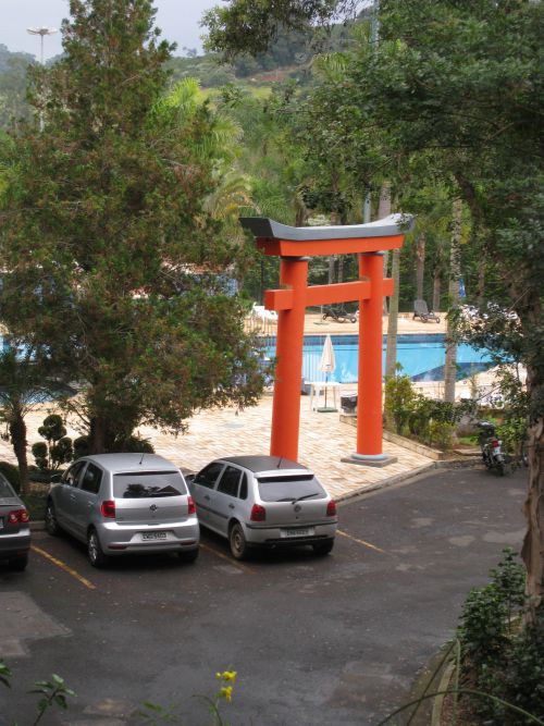 敷地内を散策した。高さ5メートルほどの赤い鳥居がホテルの近くにあり周りの緑に映える。「日本の文化が大好き」という。奥に日本庭園があった。錦鯉が泳ぐ池のそばには2本の椿の木に真っ赤な花が咲いていた。