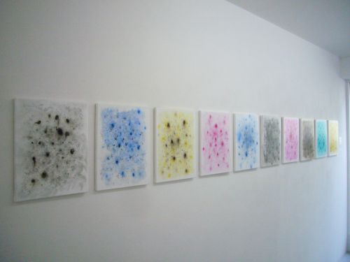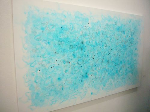 作品は、人間の細胞を表現してあり、近づいてみるとビーズがあしらわれていたり、キャンバスにいろいろと加工がしてあって繊細できれいでした。パステルカラーなので春らしくて、見ていてさわやかな気持ちになりました。
