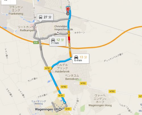 そのうちのひとつはエーデ・ワーニンゲン(Ede-Wageningen)駅とワーニンゲン大学(Wageningen University)を走るルート。地図検索サイトで確認してみると、ほんの7km前後のようです。