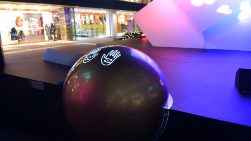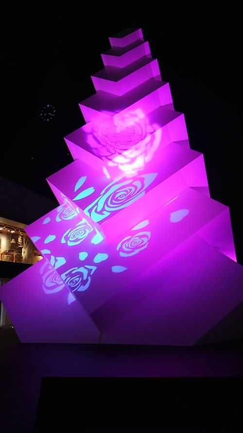 ツリーには仕掛けがしてあり「手のマークにふれてヒカリのパワーをもらおう」という企画で、ツリーの手前の巨大なボールに手をかざすと6種類の色に点灯してイラストが浮かび上がります。