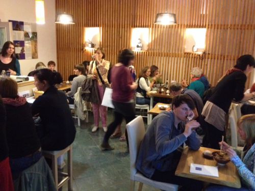 今回、朗読会の会場になったのは時々、セミナーなども開催されているという市内の小さな日本食レストラン。会の後は希望者には別途料金でラーメンも出されました。オーガニック農法で栽培された野菜だけを使ったもので、おいしく頂きました。