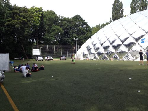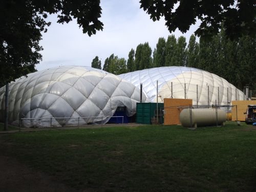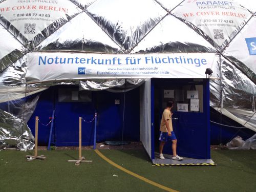 門を入り、木が生い茂る小道を抜けると施設が見えてきました。この人工的な真っ白いエア・ドーム(というのでしょうか)が難民の仮宿泊所となっているのです。