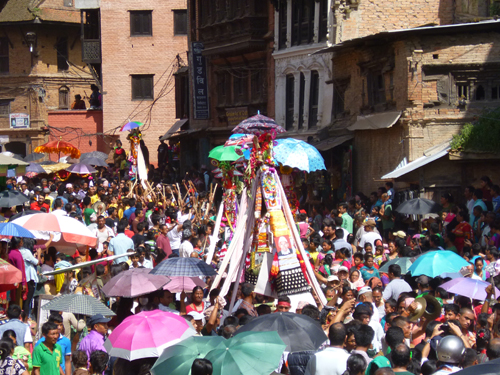4,5月で地震の被害を受けた世界遺産サイト、バクタプル市に見物に出かけてみました。で大地震後初のメジャーフェスティバルとあり、地元民の祭りにかける意気込みは例年以上。
