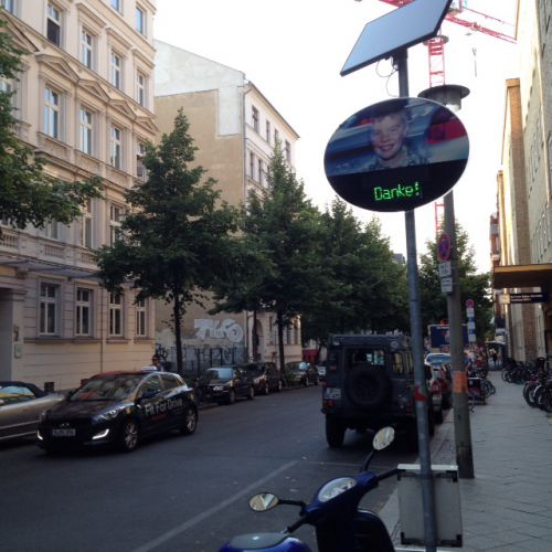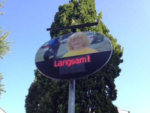 一般に学校や病院前など速度30キロ制限の道路に設置されており、車が時速30キロを超えて走っていると赤字で「Langsam!(ゆっくり!)」、速度制限を守っていると「Danke! (ありがとう!)」と表示されます。