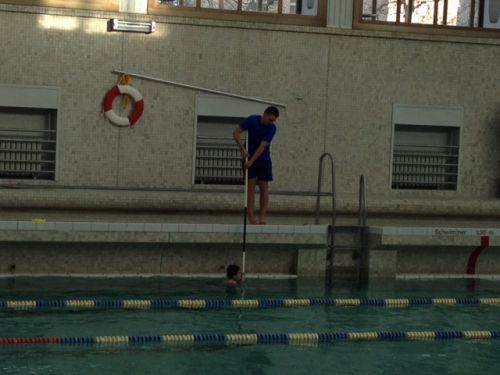 長所ばかり並べましたが、かなり雑なところもあります。先生がプールに入ることはめったになく、たいていはプールサイドからアドバイスするのみ。泳げなくなった子供は写真のような竿のような棒につかまって足の着くところまで連れてきてもらうというやり方には最初はかなり違和感がありました。