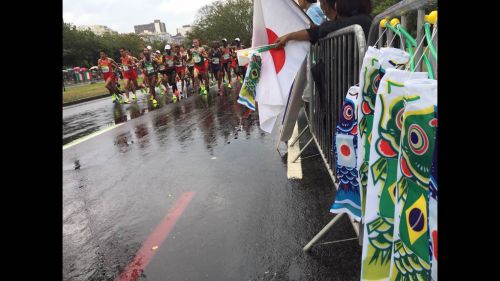 日の丸とこいのぼりでマラソン選手を応援する日本人