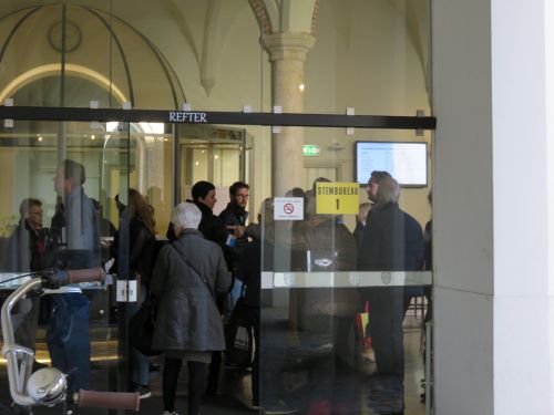 私はオランダの選挙権は持ち合わせていませんが、好奇心から近所の投票所に見学に行ってみました。上は、午後3時半ごろの投票所の様子。「行列に並ぶのが大嫌い」と言われているオランダ人が、投票のために長蛇の列を作っています。