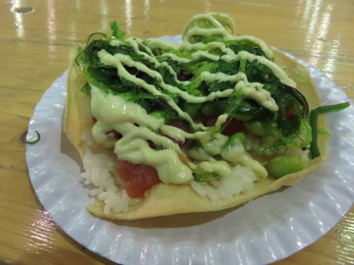 会場が暗かったのと筆者の未熟な撮影技術のせいでおいしそうに見えないと思いますが、これはこれで軽食として「あり」な味だと思いました。チップスの塩気と、ねたが上手にマッチしていました。ただ、「すし」なのかと聞かれると、日本人としては複雑な気分でしたが。